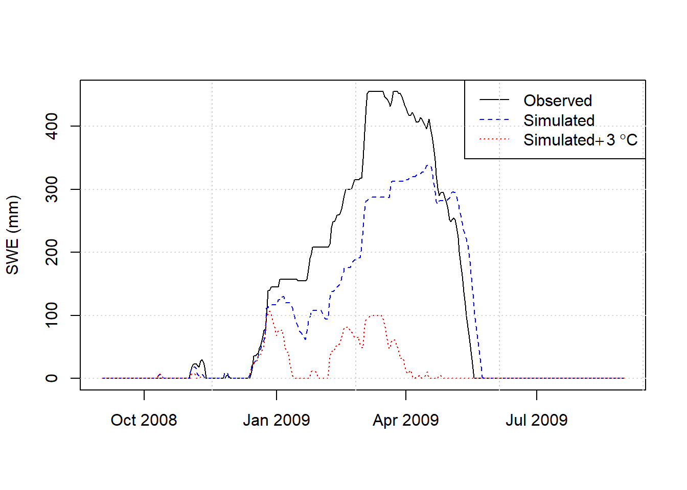 Once a reasonable calibration is obtained, the effect of increasing temperatures on SWE can be simulated by including the deltaT argument in the hydromisc::snow.sim command. Here a 3\(^\circ\)C uniform temperature increase is imposed on the optimal parameterization above.
