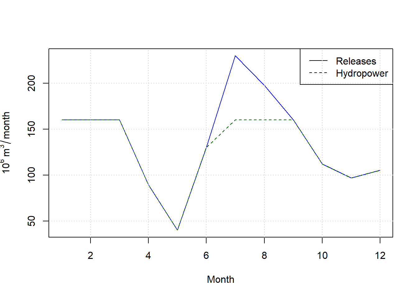 For this optimal solution, the releases exceed the capacity of the penstock supplying the hydropower plant in July and August, meaning there would be reservoir spill during those months.