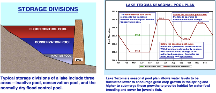 While the simple examples above illustrate how an optimal solution can be determined for a linear (and deterministic) reservoir system, in reality reservoirs are much more complex. Most reservoir operation studies use sophisticated software to develop and apply Rule Curves for reservoirs, aiming to optimally store and release water, preserving the storage pools as needed. Figure 12.9 shows how reservoir volumes are managed.